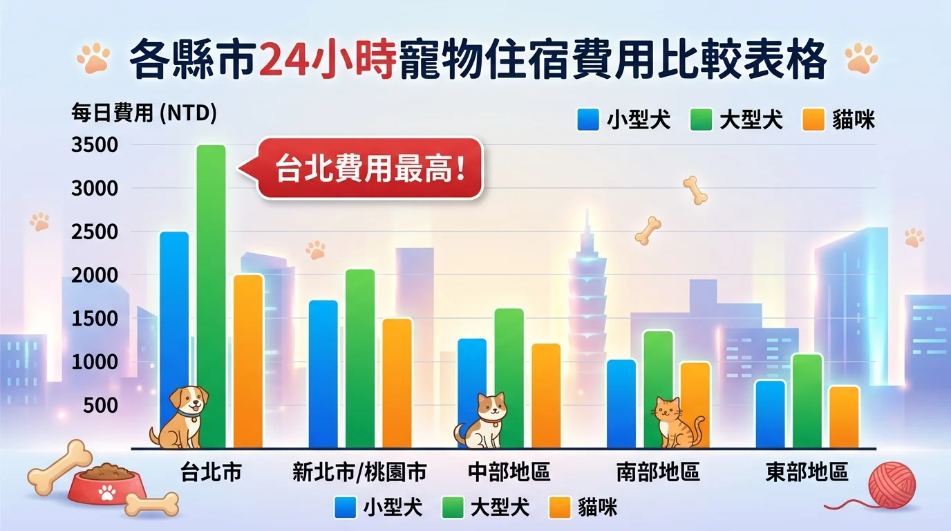 TL;DR: 24 小時寵物住宿計時制約 $50-$100/小時、計日制約 $400-$1,200/天,大型犬比小型犬貴 50-100%。選擇時注意看環境、確認有無即時監控、問清楚緊急處理流程。台北市費用最高,中南部較親民。