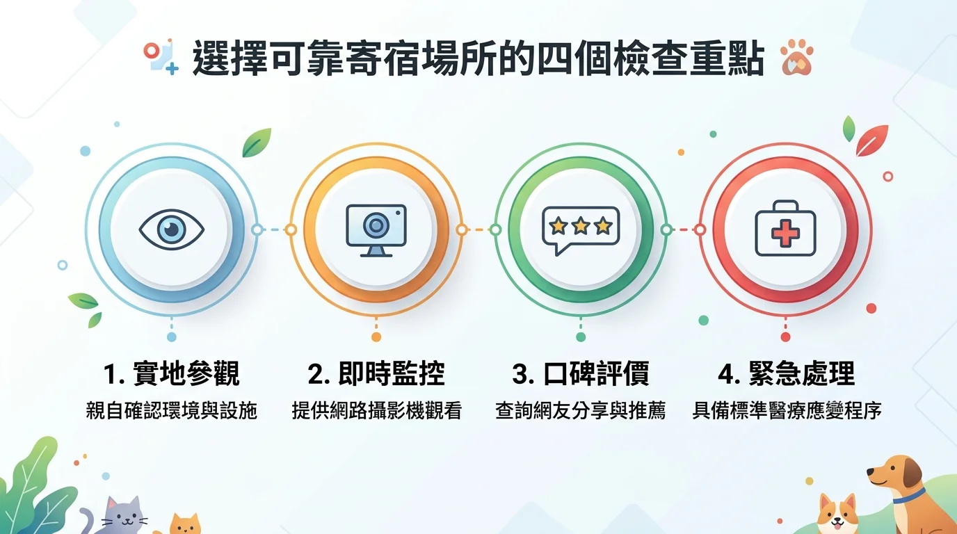 根據我們訪談多位飼主的經驗,選擇寄宿機構最重要的四個標準: