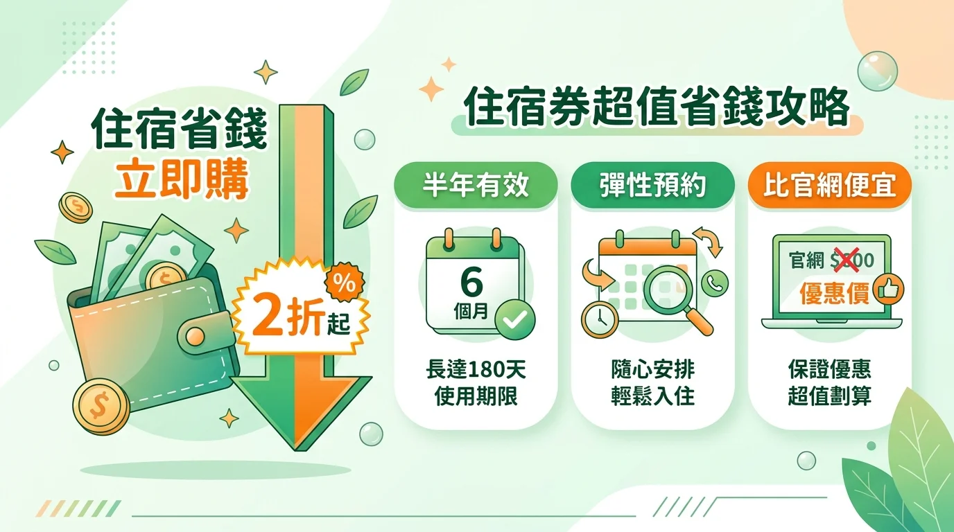 你可能會問:住宿券有什麼缺點嗎?有的。需要自己打電話跟飯店預約,假日和連假要提早很多天預約才訂得到。有些方案假日入住需要加價,買之前要看清楚條款。但整體來說,省下來的錢非常可觀。想了解更多住宿券的使用方式,看親子飯店優惠與住宿券攻略。