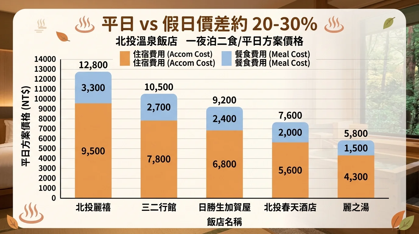 北投溫泉飯店平日和假日的價差可以到 20-30%。如果工作彈性允許,週一到週四入住最便宜。