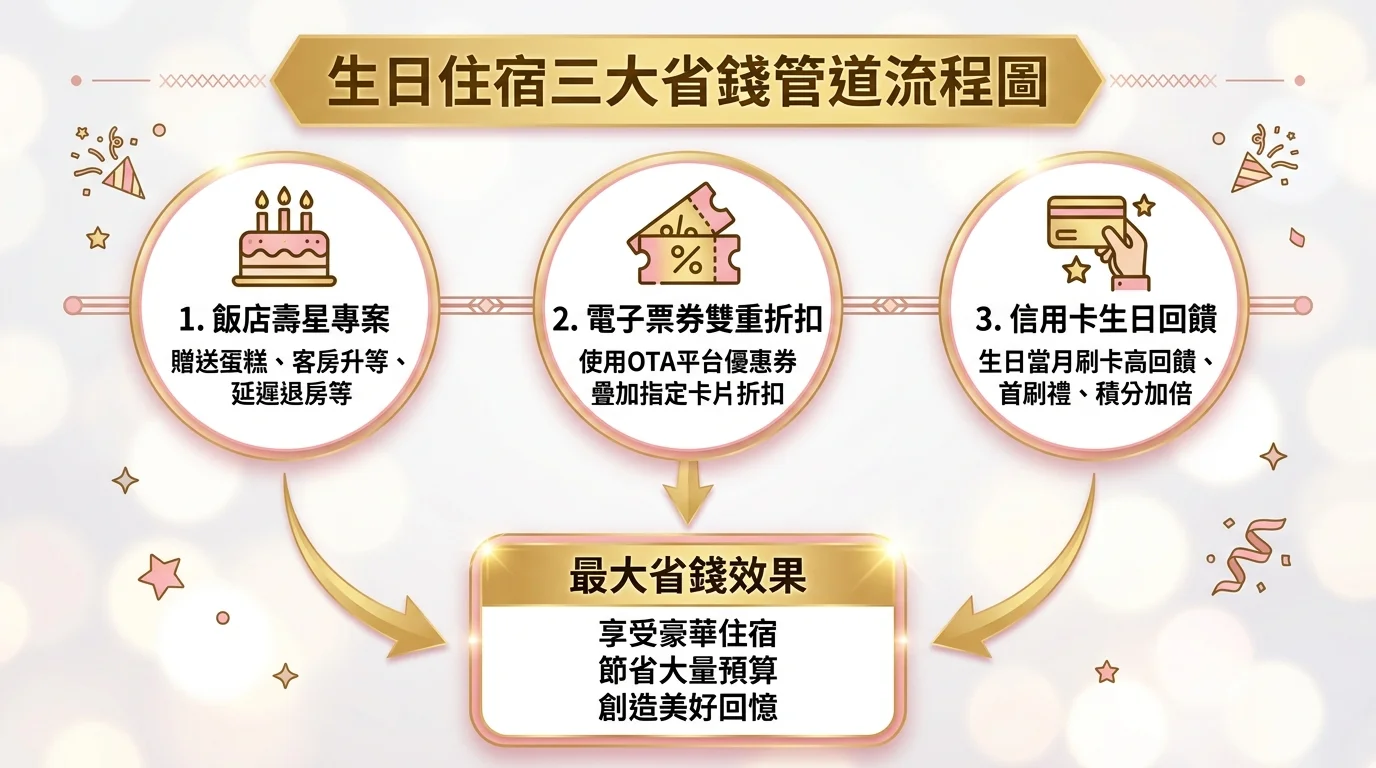 用生日回饋卡購買飯店票券,等於再多省一層。建議搭配有旅遊類別加碼的信用卡,生日月訂房回饋最大化。