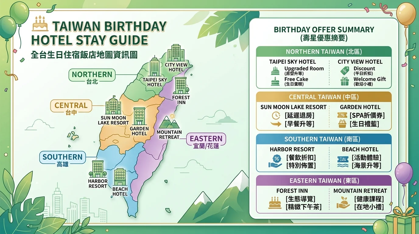 很多人不知道,其實全台有不少飯店提供壽星專屬優惠——房型升等、蛋糕贈送、餐飲折扣,只要出示身分證就能享受。問題是:這些優惠散落在各家官網,自己一間一間查太累了。