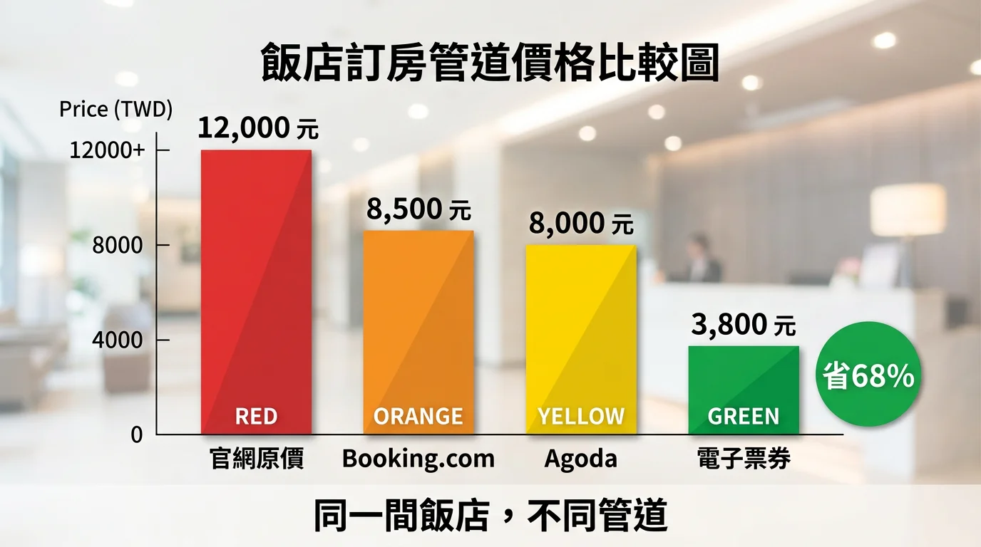 A: 價差非常明顯。以五星飯店為例,官網原價 12,000 元的房間,OTA 平台約 8,000 元,電子票券可能只要 3,000-4,000 元,省了 50-70%。缺點是需要電話預約且熱門日期可能額滿,但省下來的金額遠超過這點小麻煩。
