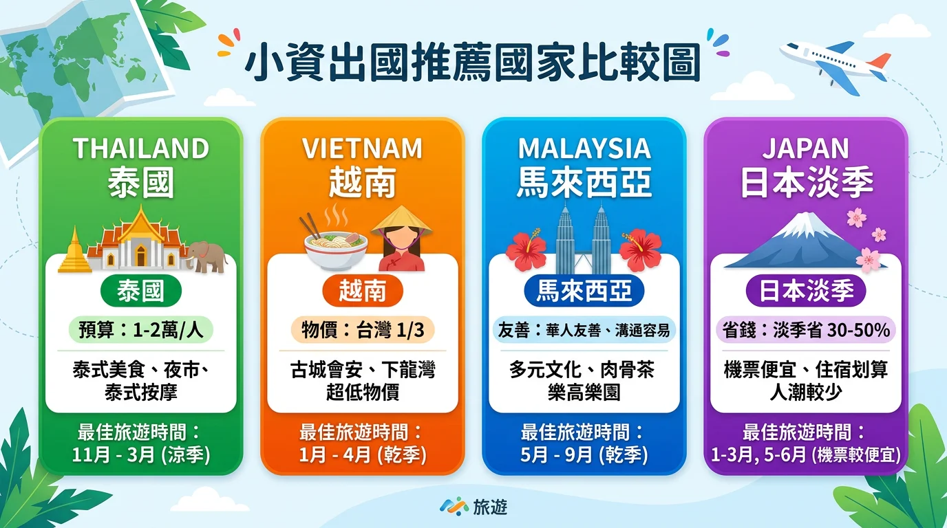 A: 以CP值來說,泰國和越南是亞洲最划算的目的地。泰國物價約台灣的 1/2-1/3,越南更低。日本在 1-3 月和 6 月的淡季價格也很親民,機票有時候不到 5,000 元。馬來西亞消費水準跟泰國差不多,但華人多溝通更方便。