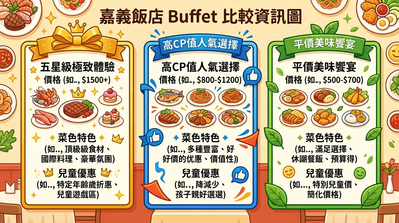 TL;DR: 嘉義五星飯店 Buffet 菜色最豐富但價格高,搭配住宿方案訂最划算。帶小孩吃飯店早餐最省事。用酷派旅遊一泊二食方案把住宿和餐飲一次打包,CP 值最高。