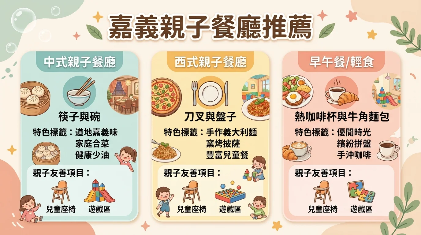 A: 有好幾間親子友善餐廳,有兒童遊戲區和兒童餐。嘉義市區選擇不少,中式、西式、早午餐都有。