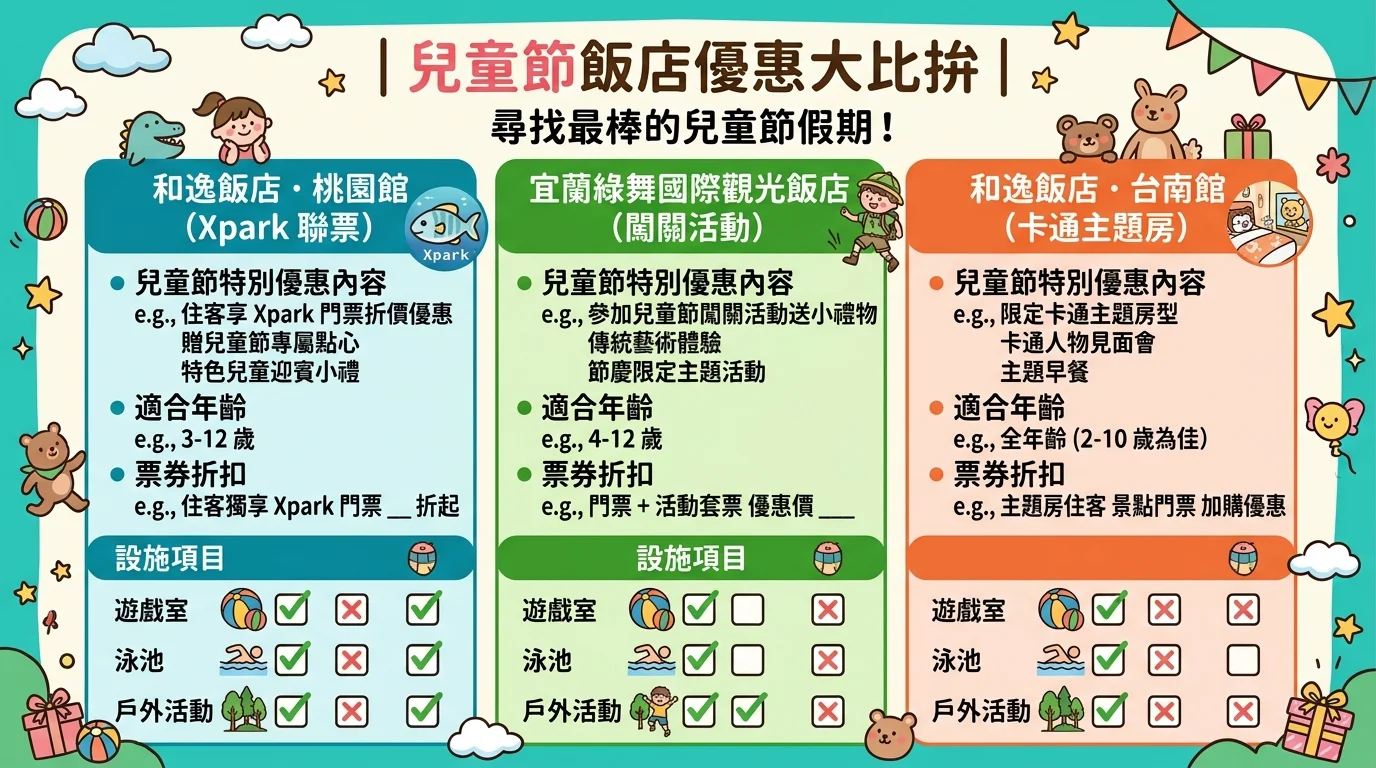 A: 常見的兒童節優惠包含:12 歲以下兒童免費入住(加床免收費)、門票買一送一(搭配景點聯票)、遊戲室加開限定活動、贈送兒童禮物包等。各飯店方案不同,建議提前 1 個月查詢確認。