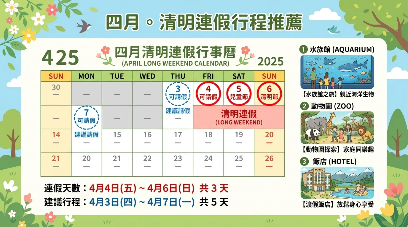 2026 年兒童節(4/4)+清明節(4/5)落在週末前後,搭配週休可以形成 3–4 天連假。如果多請 1–2 天假,還能延伸成 5 天長假,足夠安排一趟中長程旅遊。