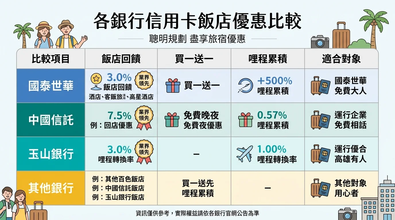 每家銀行的飯店優惠方案不太一樣。以下整理 2026 年主要銀行的方案重點。