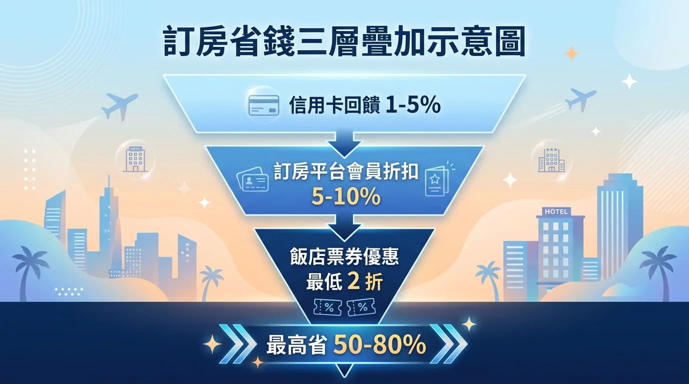 第一層:信用卡回饋(1-5%) ↓ 第二層:訂房平台會員折扣(會員價通常比公開價便宜 5-10%) ↓ 第三層:飯店票券優惠(最低 2 折起)