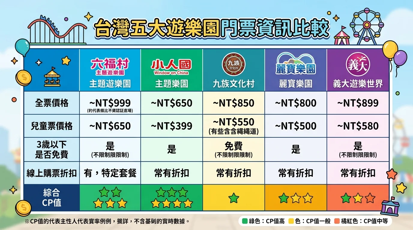 TL;DR: 3 歲以下選小人國,學齡前選六福村幼兒區,國小以上選九族或麗寶。線上購票比現場便宜 50-150 元,兒童節有兒童免費優惠。搭配附近飯店住一晚,隔天還能繼續玩。