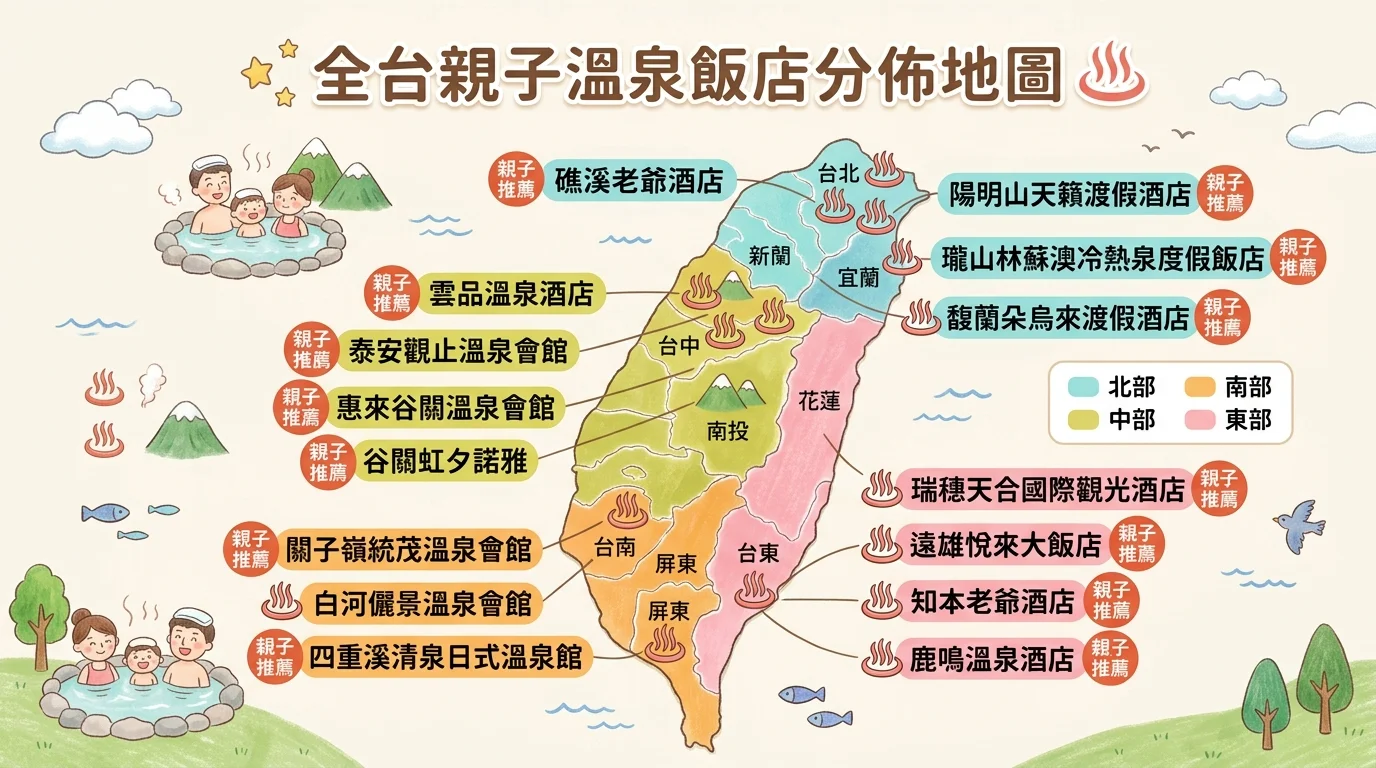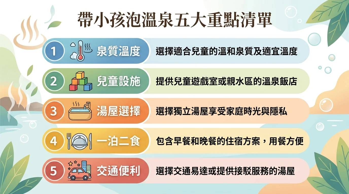 A: 優先看三個條件:有兒童遊戲室或戲水池、提供一泊二食方案、泉質為碳酸氫鈉泉(最溫和)。礁溪和知本地區的飯店在這三個條件上表現最好,是帶小孩泡湯的首選。