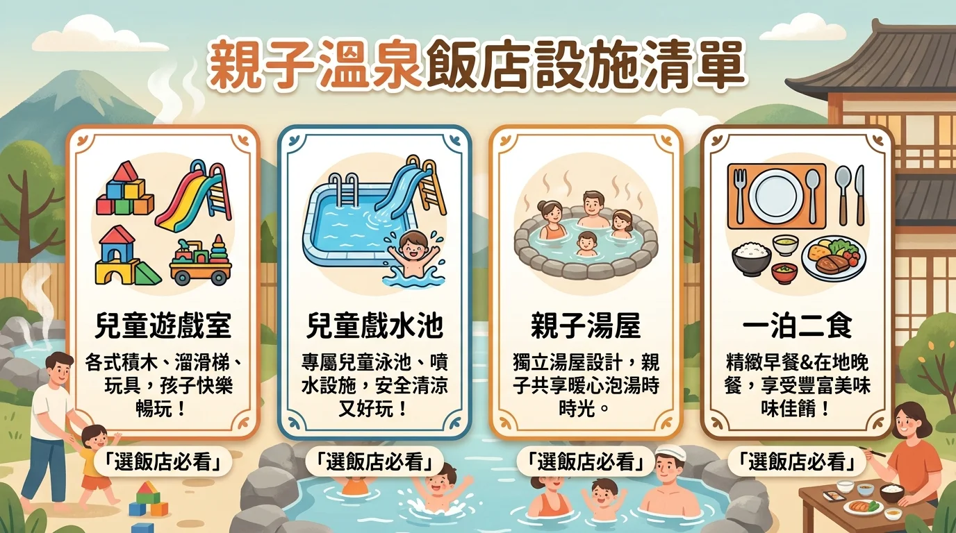 這點超級重要。有兒童遊戲室、兒童戲水池、親子活動空間的飯店,小孩不只泡湯還能玩得開心,爸媽也終於能喘口氣。我們的經驗是——沒有遊戲室的溫泉飯店,小孩泡完湯 30 分鐘就開始喊無聊。