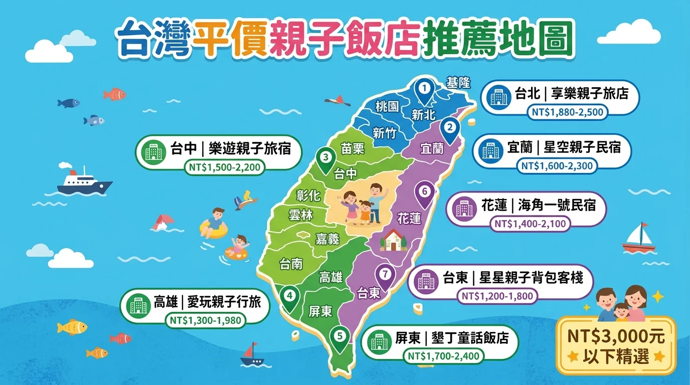 A: 親子飯店價格範圍很大。平價帶 2,000-3,000 元(如福容花蓮、嘉義耐斯王子)、甜蜜帶 3,000-6,000 元(如日月潭大淶閣、和逸桃園)、五星級 8,000 元以上(如礁溪長榮鳳凰、台南大員皇冠)。善用住宿券可以用 2-5 折入住,等於平價預算住五星體驗。