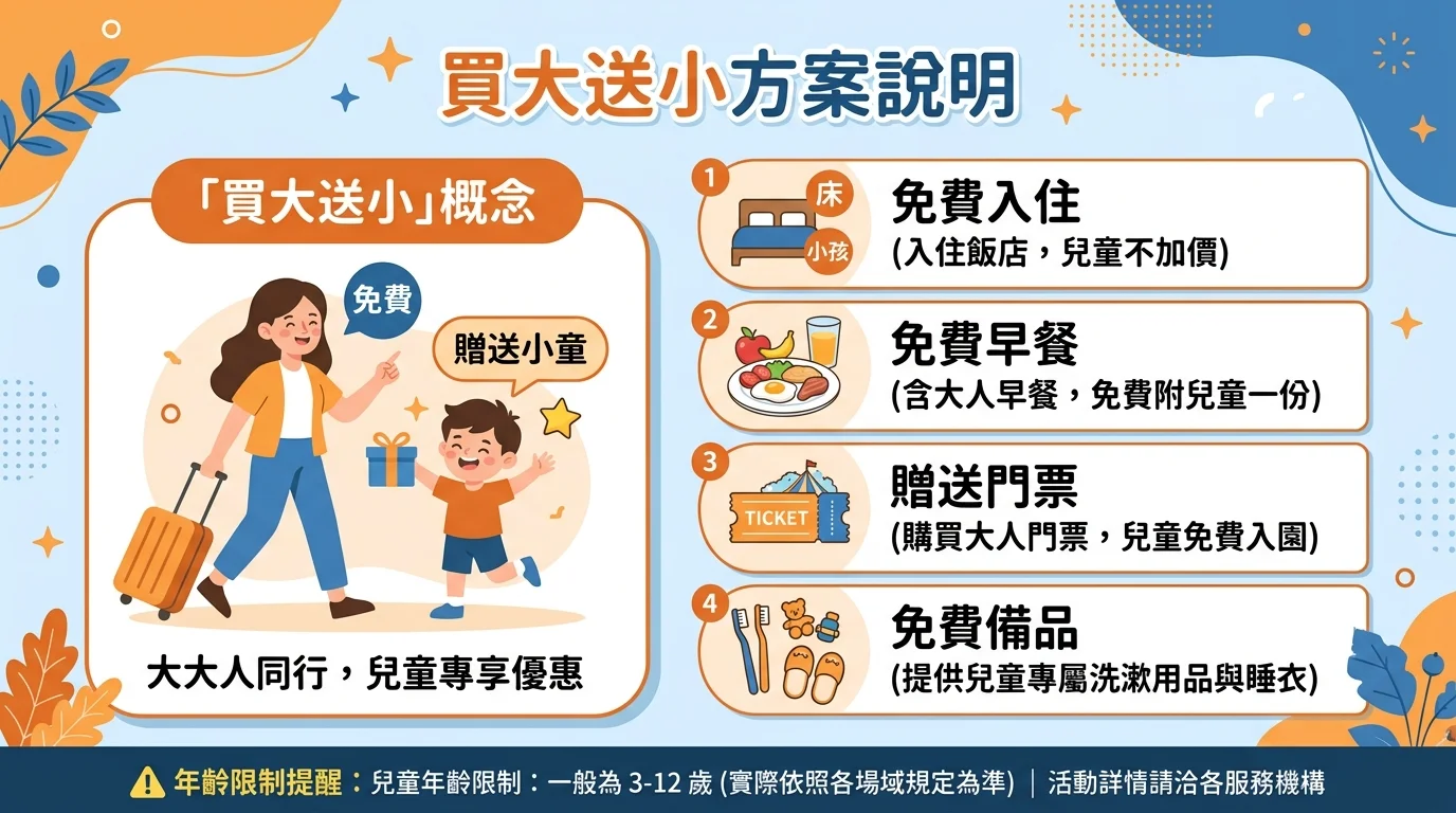 A: 買大送小就是大人付費、小孩免費入住的飯店優惠方案。買了大人的住宿方案,符合年齡限制的小孩可以免費跟著入住。常見標準是 6 歲以下或 12 歲以下免費,各飯店規定不同,訂房前務必確認。