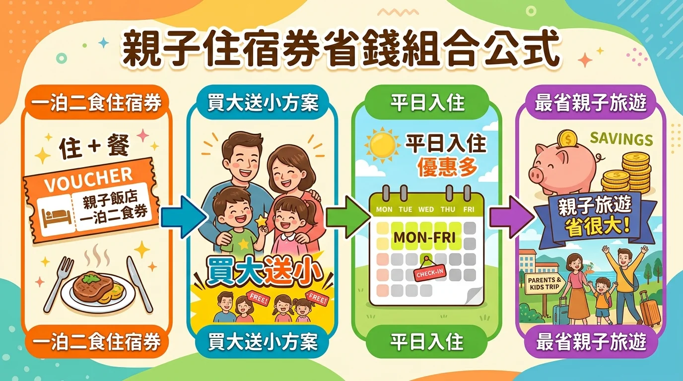 最划算的組合就是這個:一泊二食住宿券搭配買大送小方案。住宿、兩餐、小孩入住全部包在一起,整體花費是所有訂法中最低的。