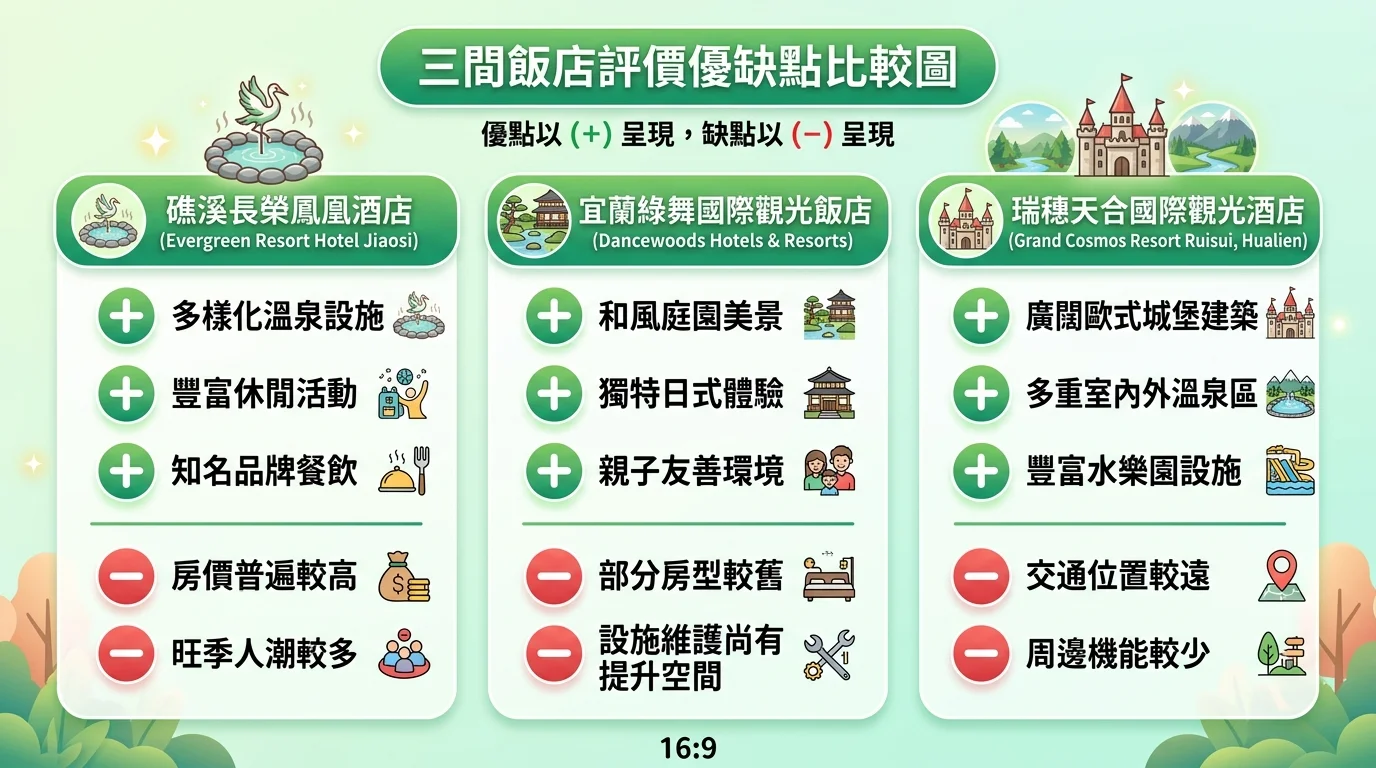 - 負面:交通較不便(建議自駕)、餐飲選擇有限、價格偏高