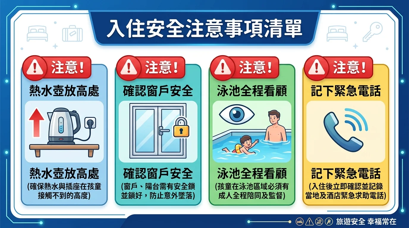 - 確認窗戶和陽台的安全。有幼兒的家庭特別注意——飯店窗戶通常沒有兒童安全鎖