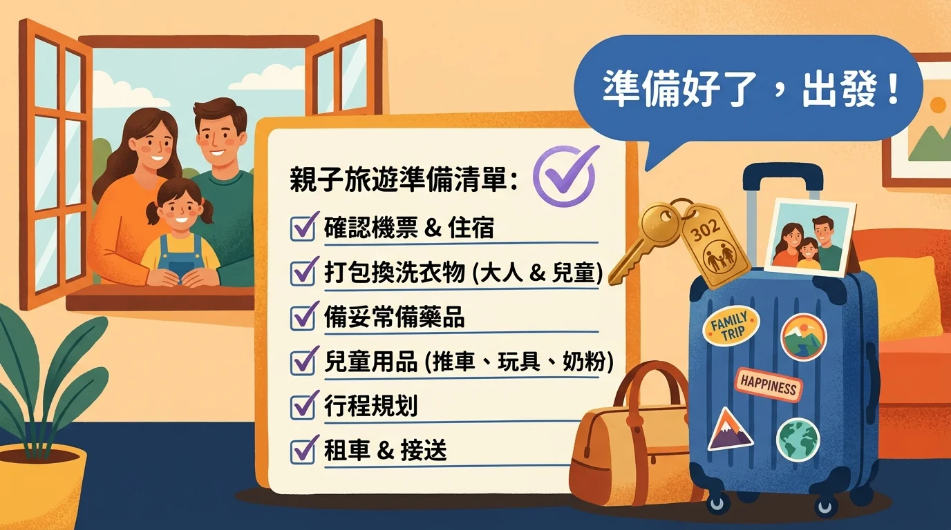 A: 帶嬰兒必帶:奶粉/母乳、奶瓶、尿布(多帶備用)、換洗衣物 2-3 套、安撫物品(小被被、安撫玩偶)、健保卡、常備藥物、防蚊液。大部分親子飯店會提供嬰兒床(需預約)和嬰兒澡盆。訂房時問清楚飯店提供什麼,就知道哪些不用帶,減少行李量。