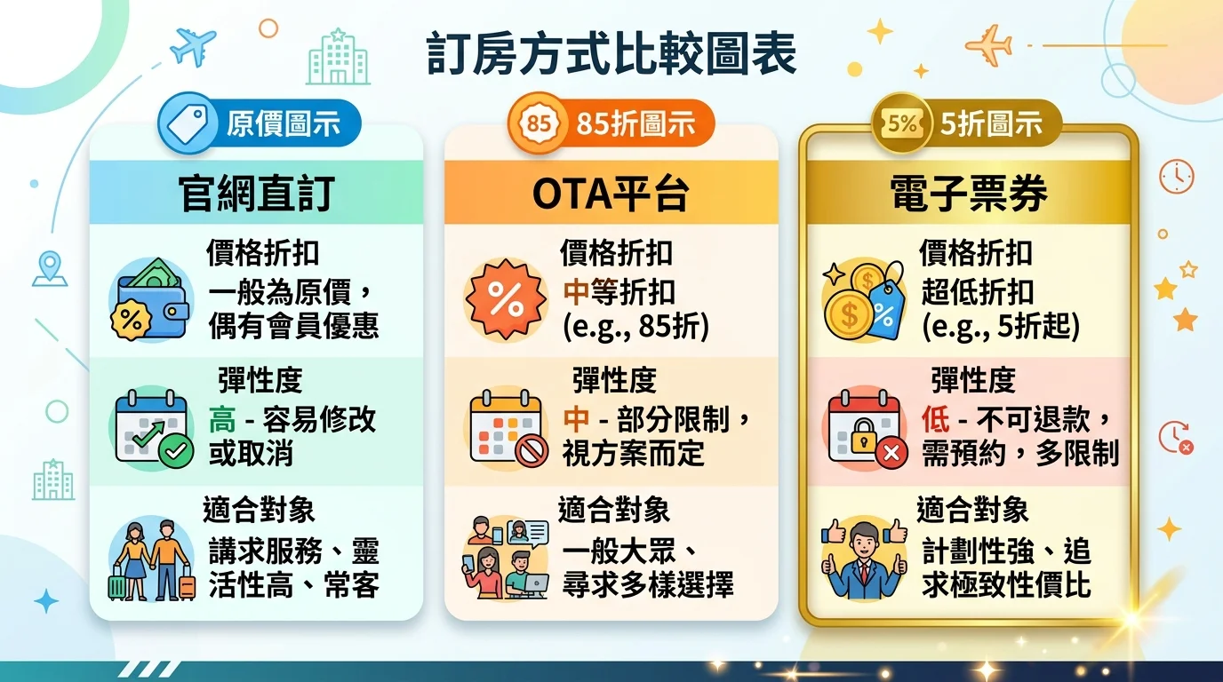 為什麼比較便宜?因為票券平台是批量採購,拿到的折扣比你個人訂房好很多。比官網直訂通常便宜 2-5 折。