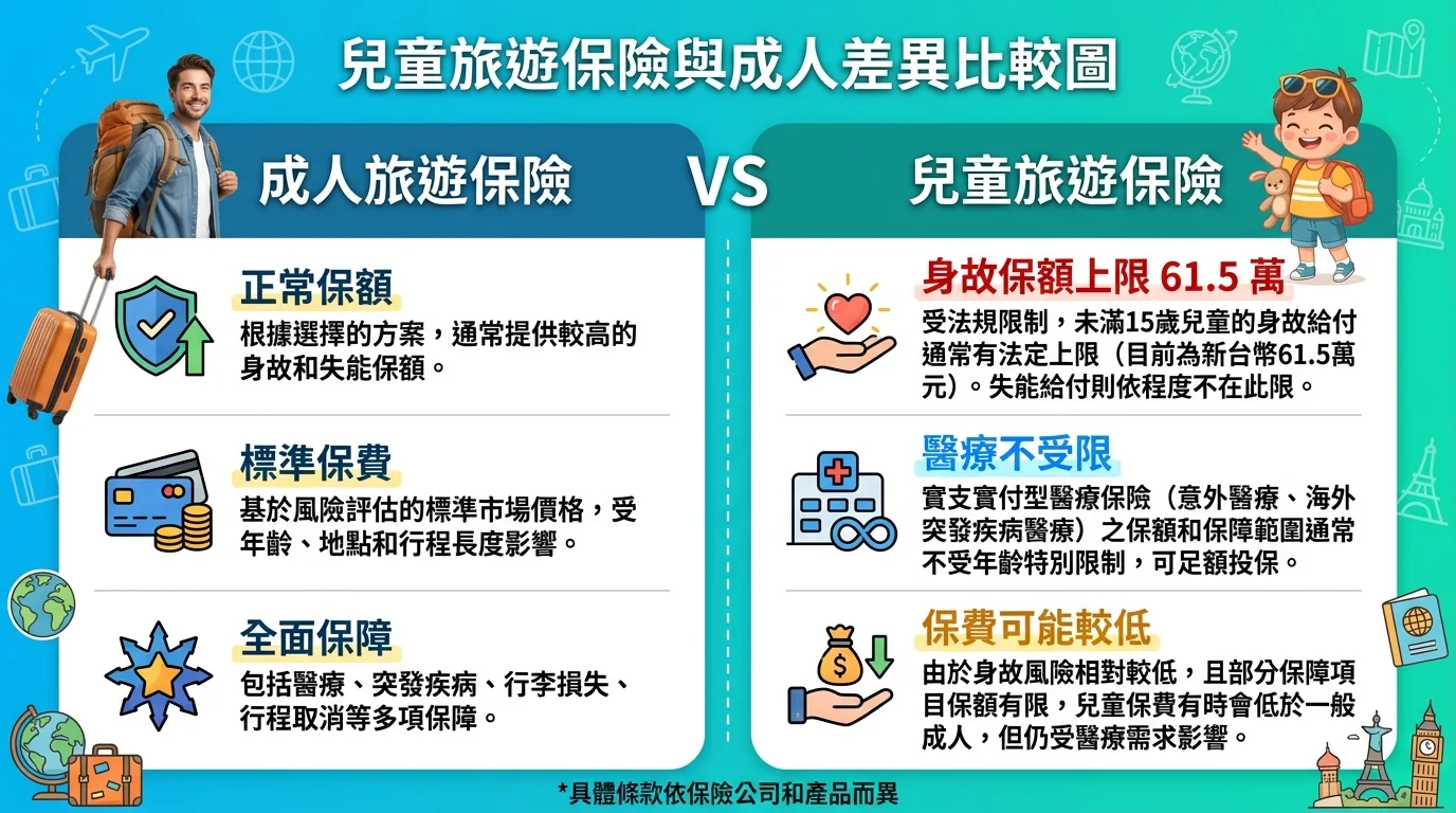 最大的差異在身故保額。依保險法第 107 條規定,未滿 15 歲兒童的身故保險金有法規上限(目前為 61.5 萬元)。這是法律硬性規定,不管哪家保險公司都一樣,沒辦法突破。