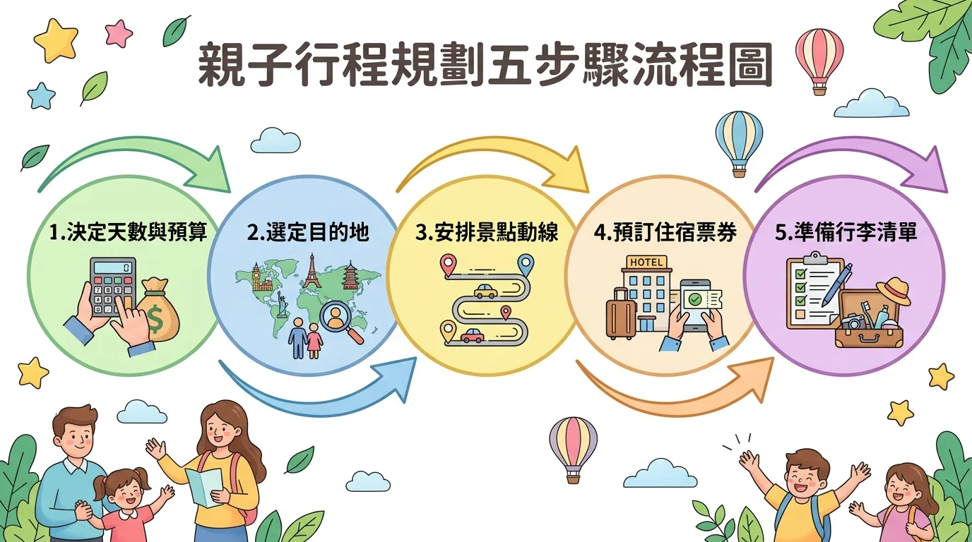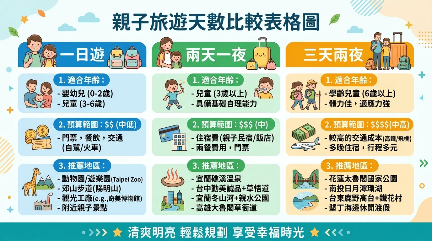 TL;DR: 親子旅遊行程規劃的核心就是「天數決定目的地、預算決定住宿方式」。一日遊預算約 1,000-3,000 元適合練手,兩天一夜 5,000-10,000 元 CP 值最高,三天兩夜 10,000-20,000 元能深度玩一個地區。用電子票券提前訂房,比官網省 2-5 折,是最聰明的省錢方式。