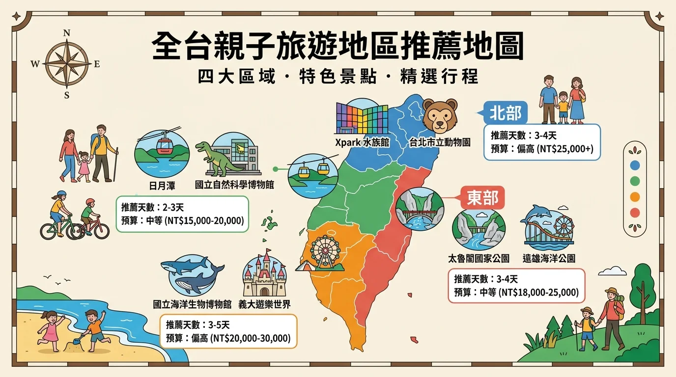 A: 北部推薦宜蘭礁溪(溫泉+傳藝中心),中部推薦台中+日月潭(科博館+環湖+九族),南部推薦台南+墾丁(古蹟+海生館),東部推薦花蓮(太魯閣+海洋公園)。一家四口預算約 10,000-20,000 元。