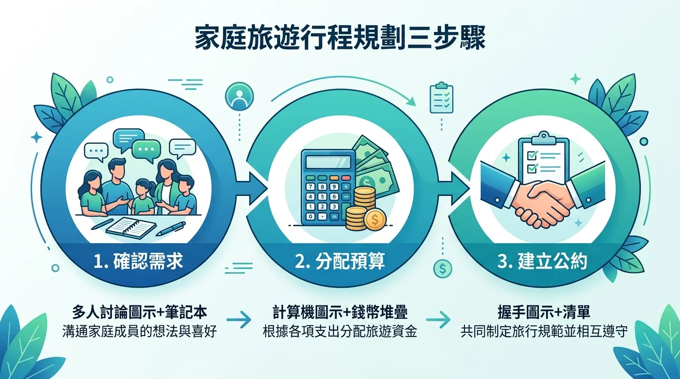 TL;DR: 家庭旅遊行程規劃三步驟:確認成員需求、分配預算、建立旅遊公約。住宿佔旅費 40-60%,用電子票券省最多。國內推薦宜蘭(兩天一夜最熱門)、花蓮(三天兩夜自然系),出國首選日本(親子設施完善、小學生免費同住)。