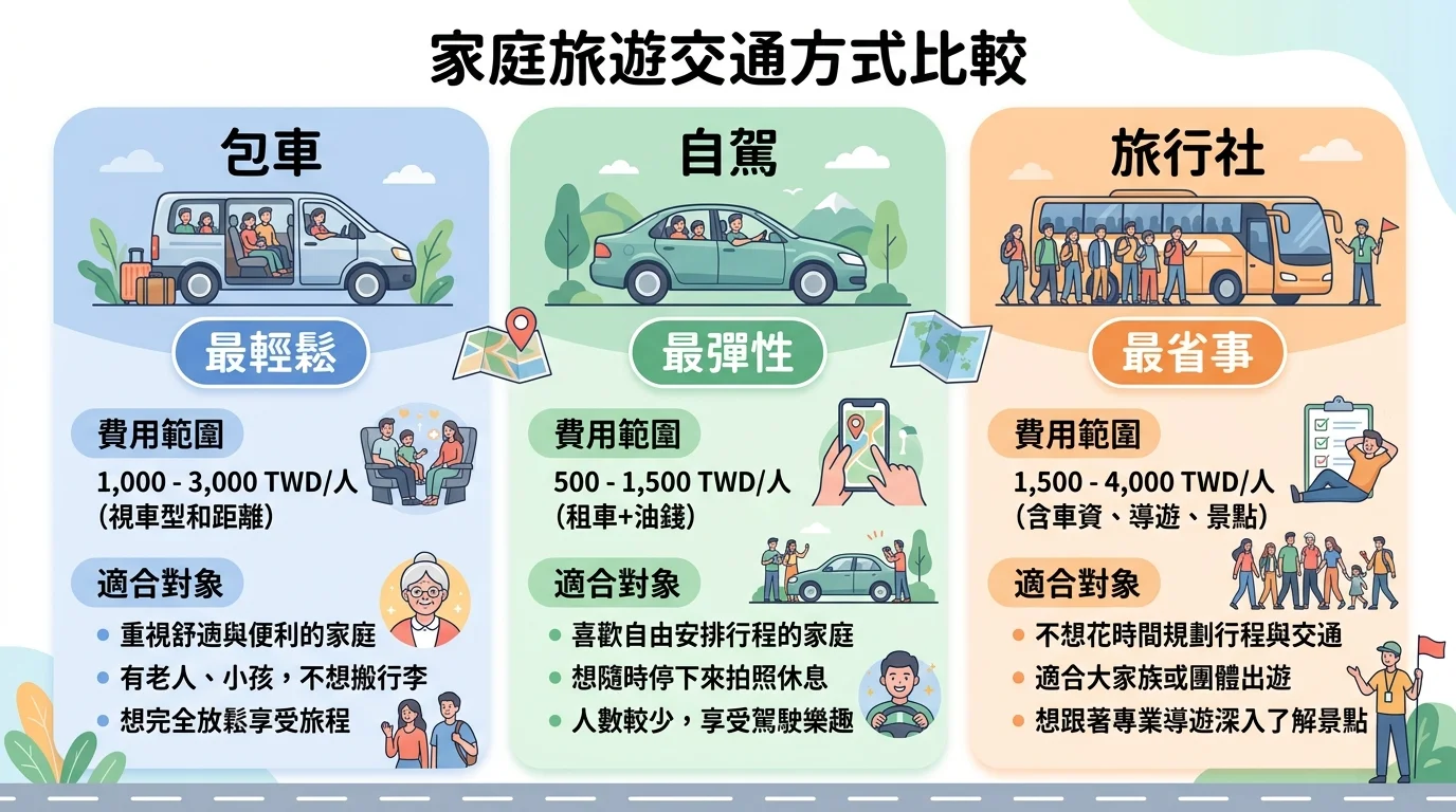 家庭旅遊包車 vs 自駕 vs 旅行社比較