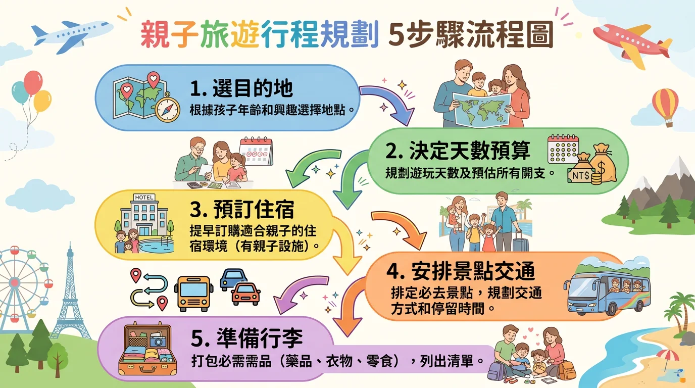 TL;DR: 親子旅遊行程規劃 5 步驟:選目的地(依孩子年齡)→ 決定天數與預算(住宿佔 40-60%)→ 預訂住宿(電子票券最彈性)→ 安排景點(每天不超過 2-3 個)→ 準備行李。跟團省事但沒彈性,帶小孩國內旅遊建議自由行。