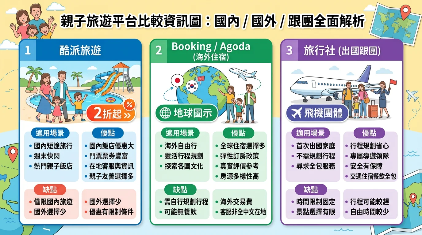 A: 國內旅遊強烈建議自由行,彈性高且省下團費。帶小孩最需要的就是彈性——小孩累了隨時可以休息、想多玩就多玩。出國旅遊第一次可以考慮跟團(交通餐食都安排好),之後有經驗再試自由行。國內住宿推薦用酷派旅遊電子票券,先買後約最彈性。