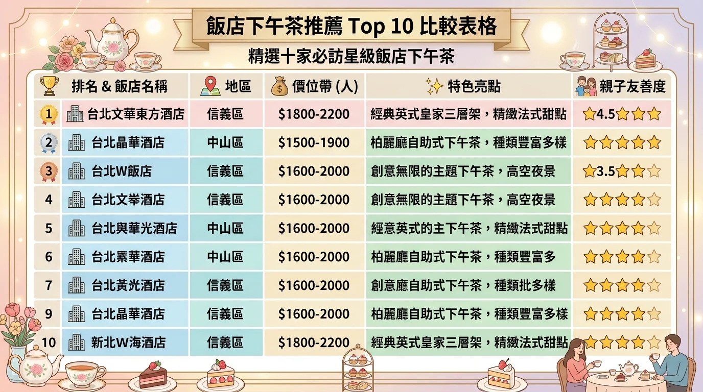 TL;DR: 2026 飯店下午茶首推礁溪長榮鳳凰酒店搭配溫泉,和逸桃園館親子友善度最高。平日前往比假日便宜 15-25%,部分飯店有買一送一活動,搭配一泊送二食方案住宿送餐更划算。
