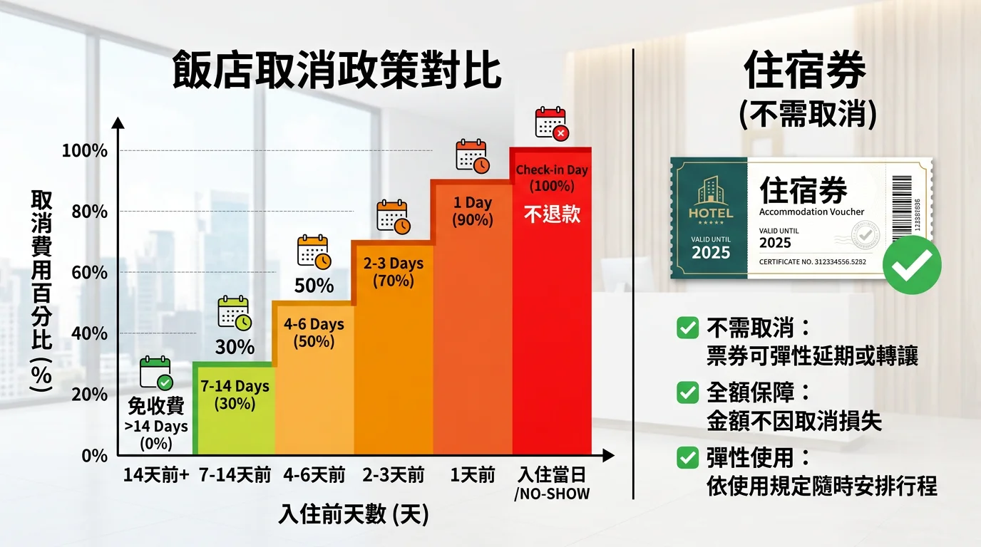 A: 依交通部觀光署定型化契約規範,入住 14 天前免費取消,7-13 天收房價 30%,3-6 天收 50%,1-2 天收 70%,當日全額。各飯店可能有不同規定,訂房時務必確認取消條款。用住宿券則不存在取消問題。