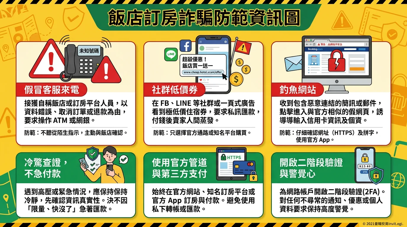 - 假冒客服來電:打電話說「你的訂房資料有問題」,要你提供信用卡資訊