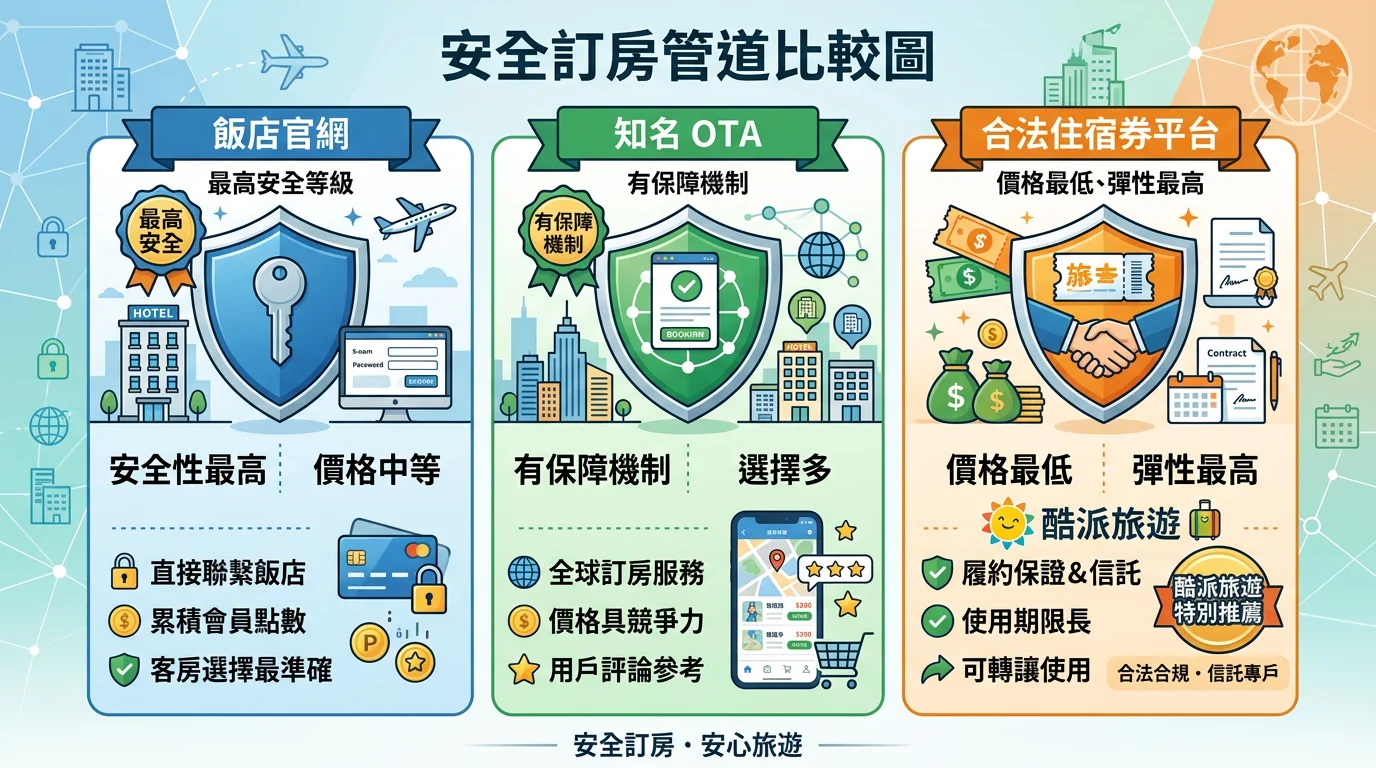 - 合法住宿券平台:如酷派旅遊,與飯店直接合作、票券保證正品