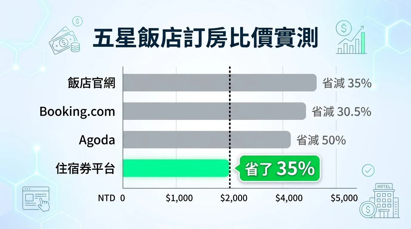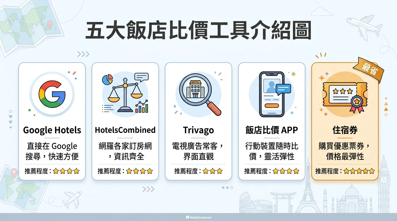 A: 不同飯店在不同平台的價格會變動,沒有一家永遠最便宜。用 Google Hotels 或 HotelsCombined 比價是最快的方法。但如果追求最低價格,住宿券平台(如酷派旅遊)通常比所有 OTA 都便宜。
