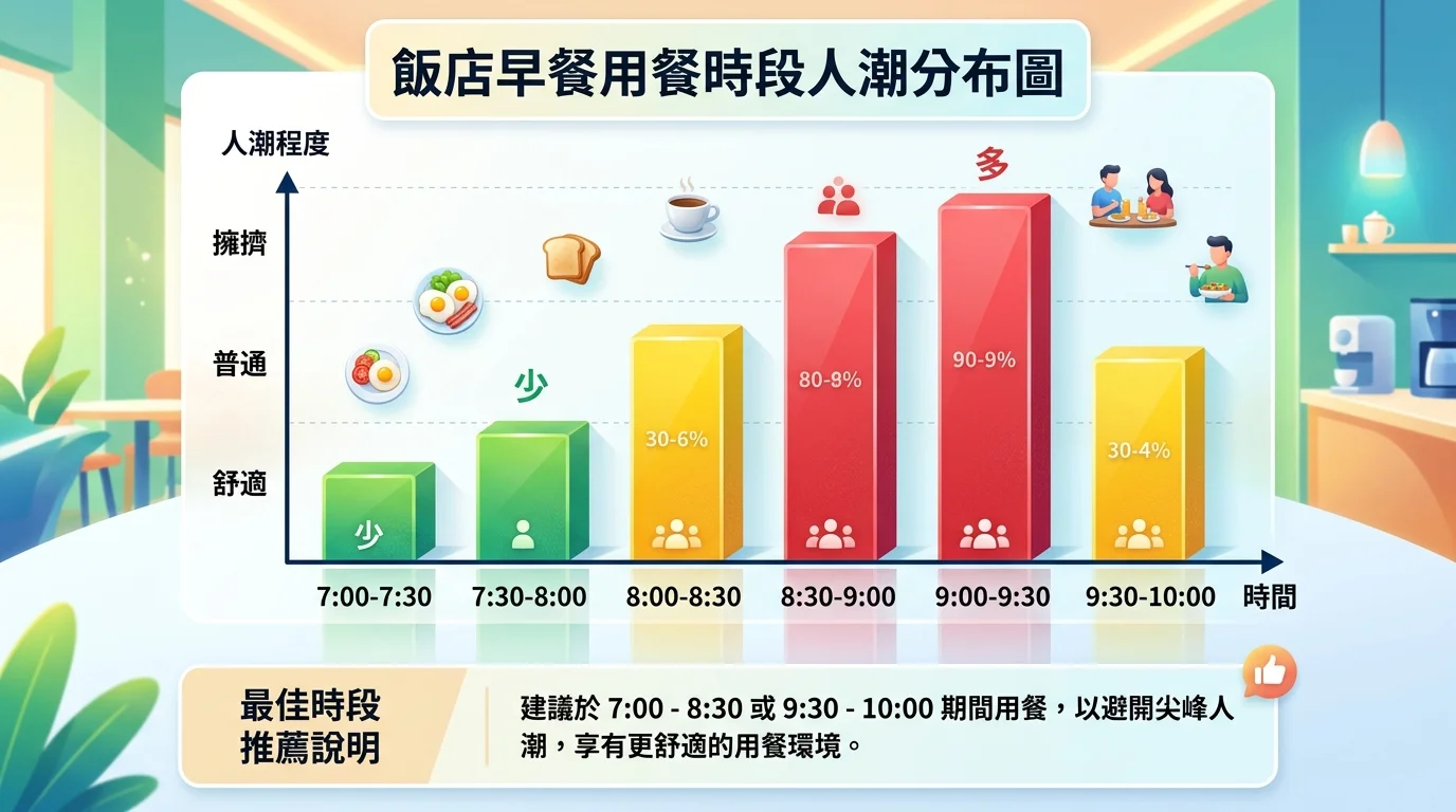 根據我們帶小孩住過超過 20 間飯店的經驗,最佳用餐時間是 7:00-7:30。這時候食材最新鮮、人最少,帶小孩可以慢慢吃。最擁擠的是 8:30-9:30,大量房客退房前來吃早餐,座位要搶、熱食排隊,小孩容易不耐煩。