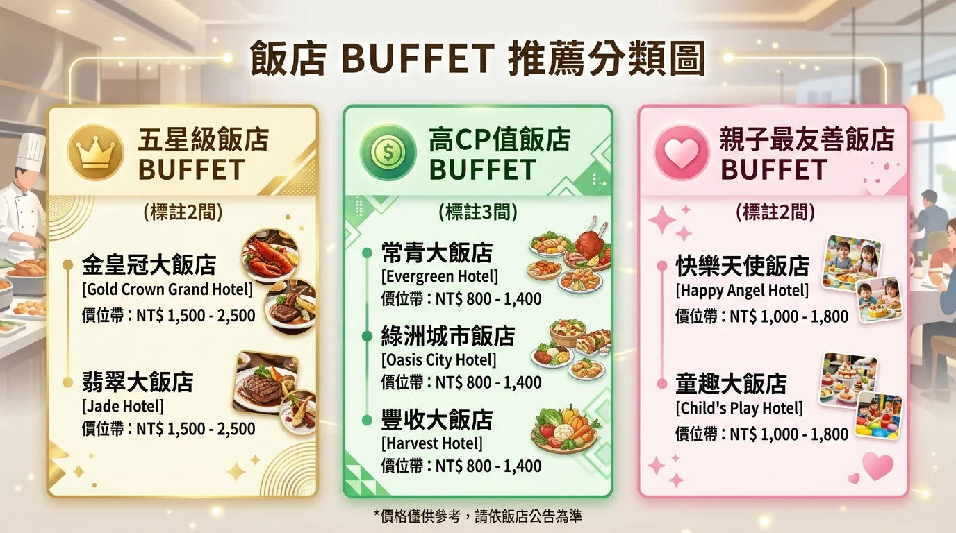 2024 年台灣餐飲業營業額達 1 兆 378 億元,年增 3.6%(經濟部統計處),飯店自助餐是其中高成長類別。多數飯店 Buffet 提供 60-120 道菜色,6 歲以下兒童免費入場。帶小孩外食的爸媽都有一個共同經驗:看菜單看半天,點了小孩不吃,然後全桌的人都在催他快點吃。Buffet 直接跳過這個痛苦的環節。