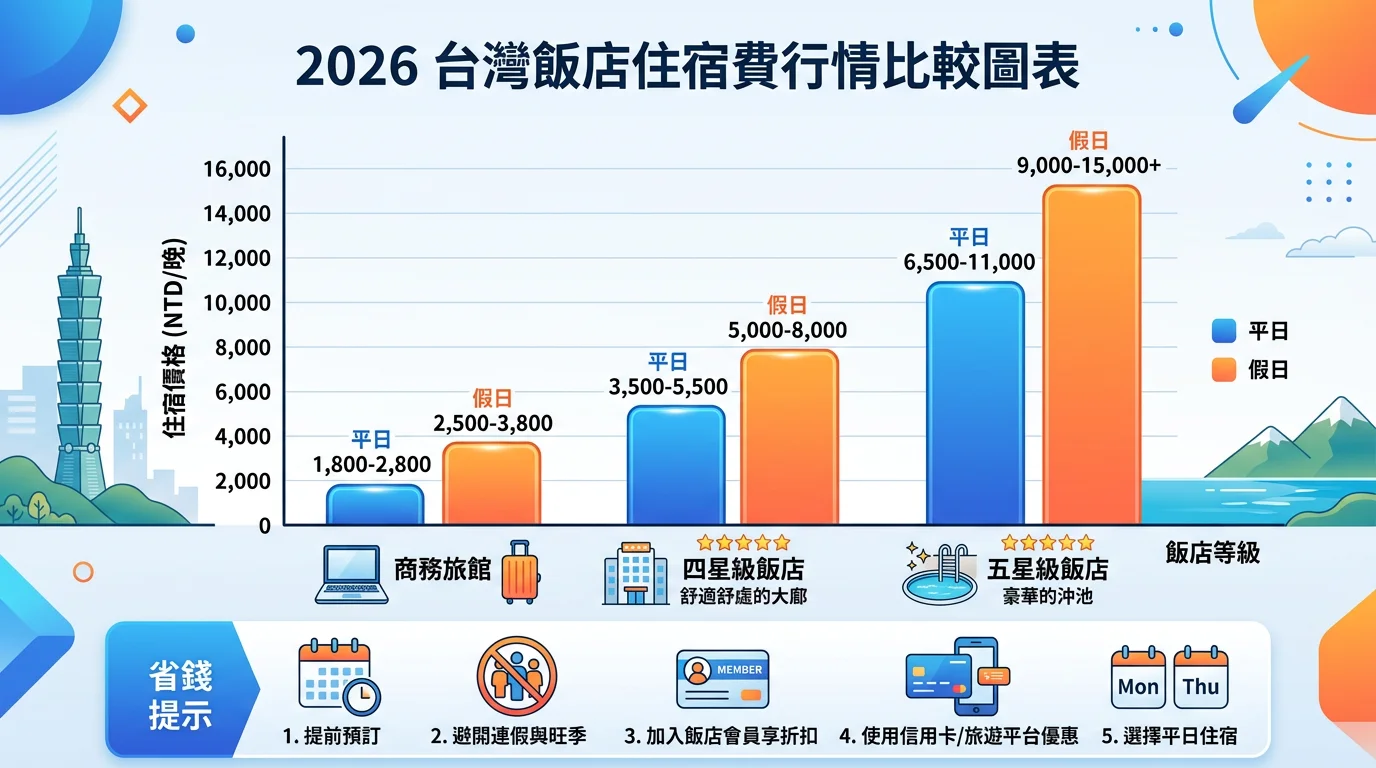 根據各大訂房平台的公開資料,2026 年台灣四星級飯店平日一晚約 3,000-6,000 元,假日則飆到 4,500-8,000 元(各大飯店官網公開牌價, 2026)。台灣飯店的住宿費在亞洲不算便宜,各等級飯店的一晚房價大致如下: