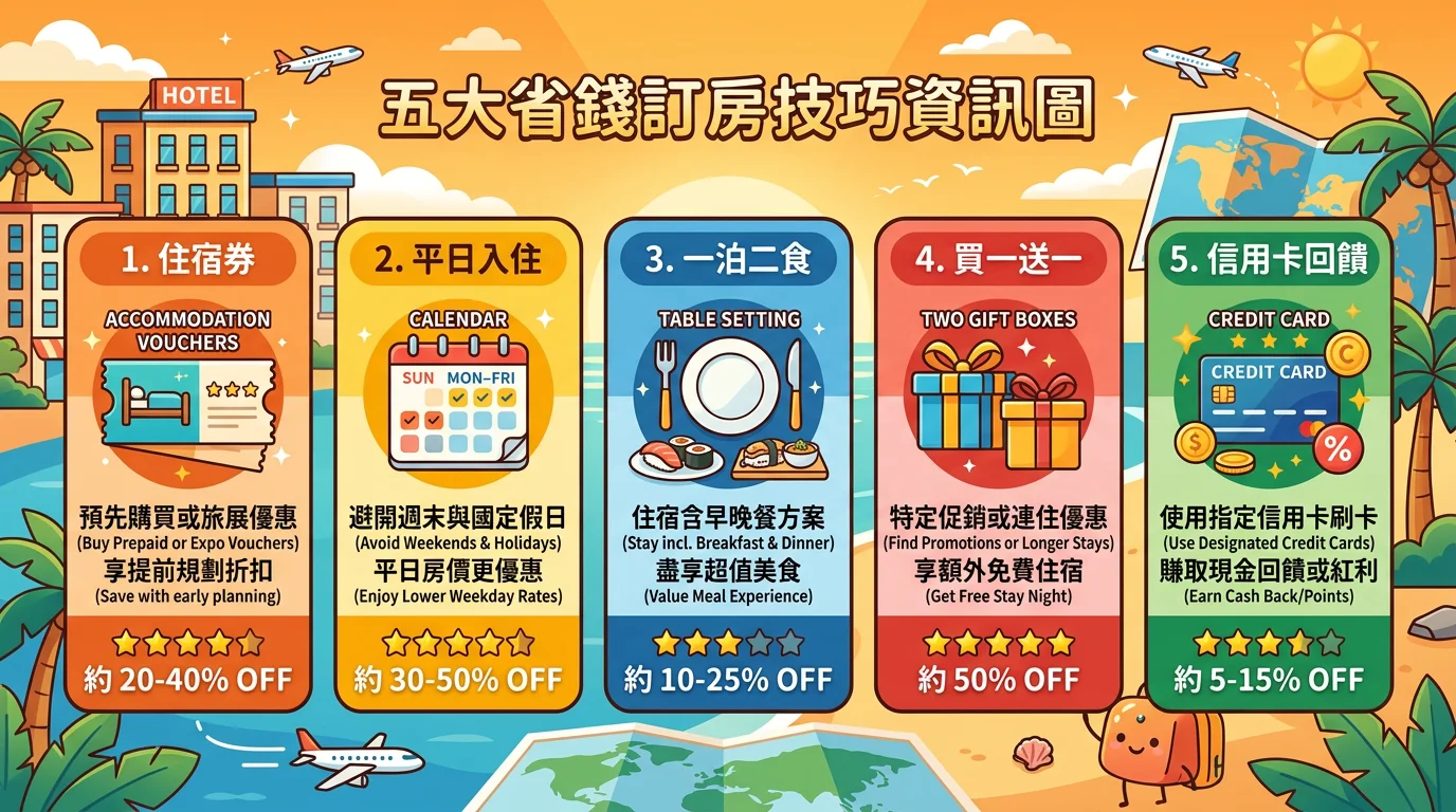 住好飯店不一定要花大錢。根據各飯店官網的平日/假日房價對比,平日與假日的價差在 30-50% 之間(各飯店官網, 2026),掌握以下五個技巧至少可以幫你省下三到五成的住宿費。我們實際測試過各種訂房方式,這些方法真的有效。