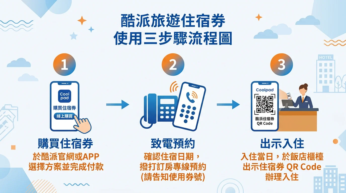 A: 三步驟:先在住宿券平台購買電子票券,接著在有效期限內致電飯店預約入住日期,最後入住當天出示手機 QR Code 即可。酷派旅遊的電子票券有效期為半年,根據平台資料,平均每張票券可省下原價的 50-80%。