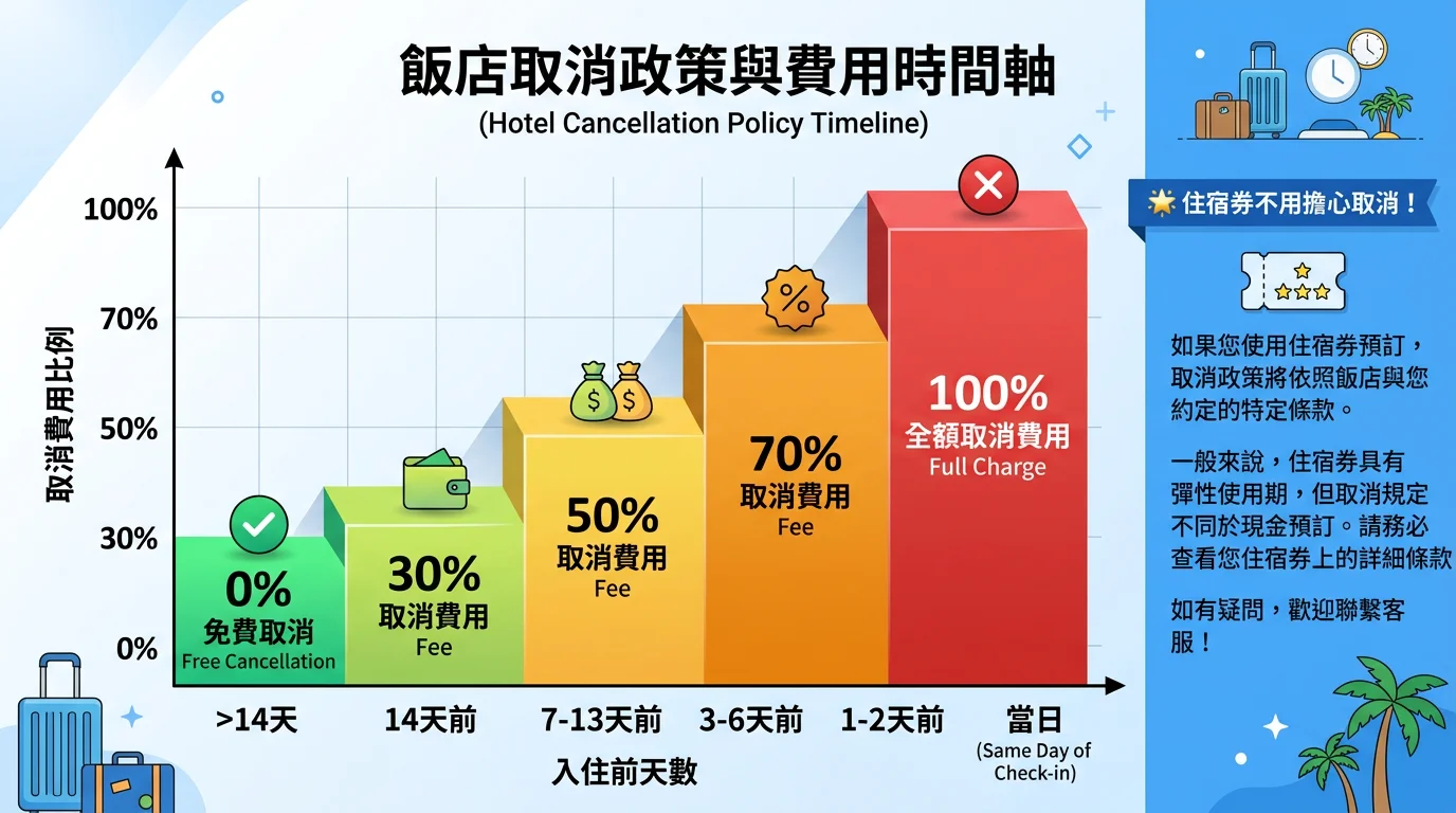 A: 依交通部觀光署規範,入住 14 天前可免費取消,7-13 天收房價 30%,3-6 天收 50%,1-2 天收 70%,當日取消收全額。不過用住宿券就沒有取消問題,因為是「買了再約」的模式,還沒預約就不存在取消。