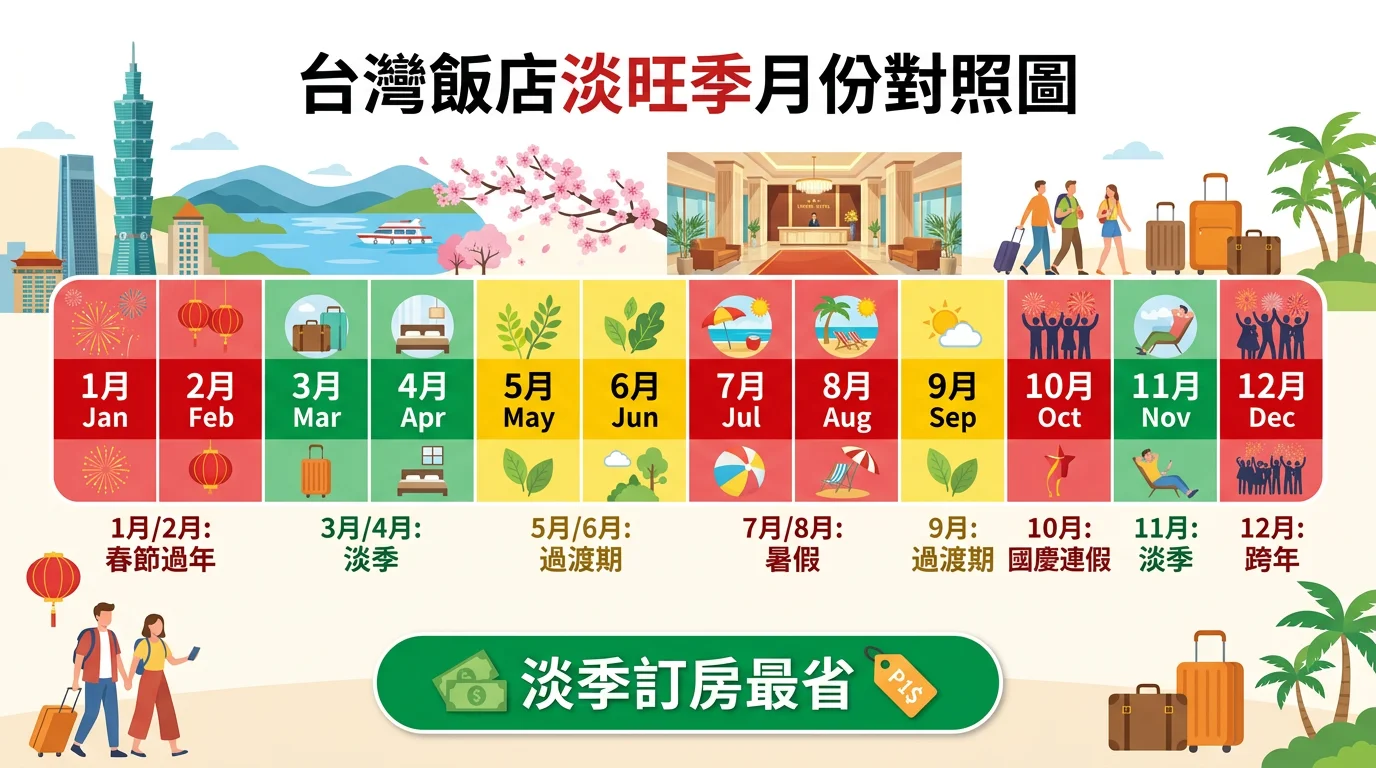 淡季呢?3-4 月和 10-11 月(除連假外)是價格最甜的時候。飯店為了填房率會釋出更多優惠,有些甚至會主動降價或推出限時方案。