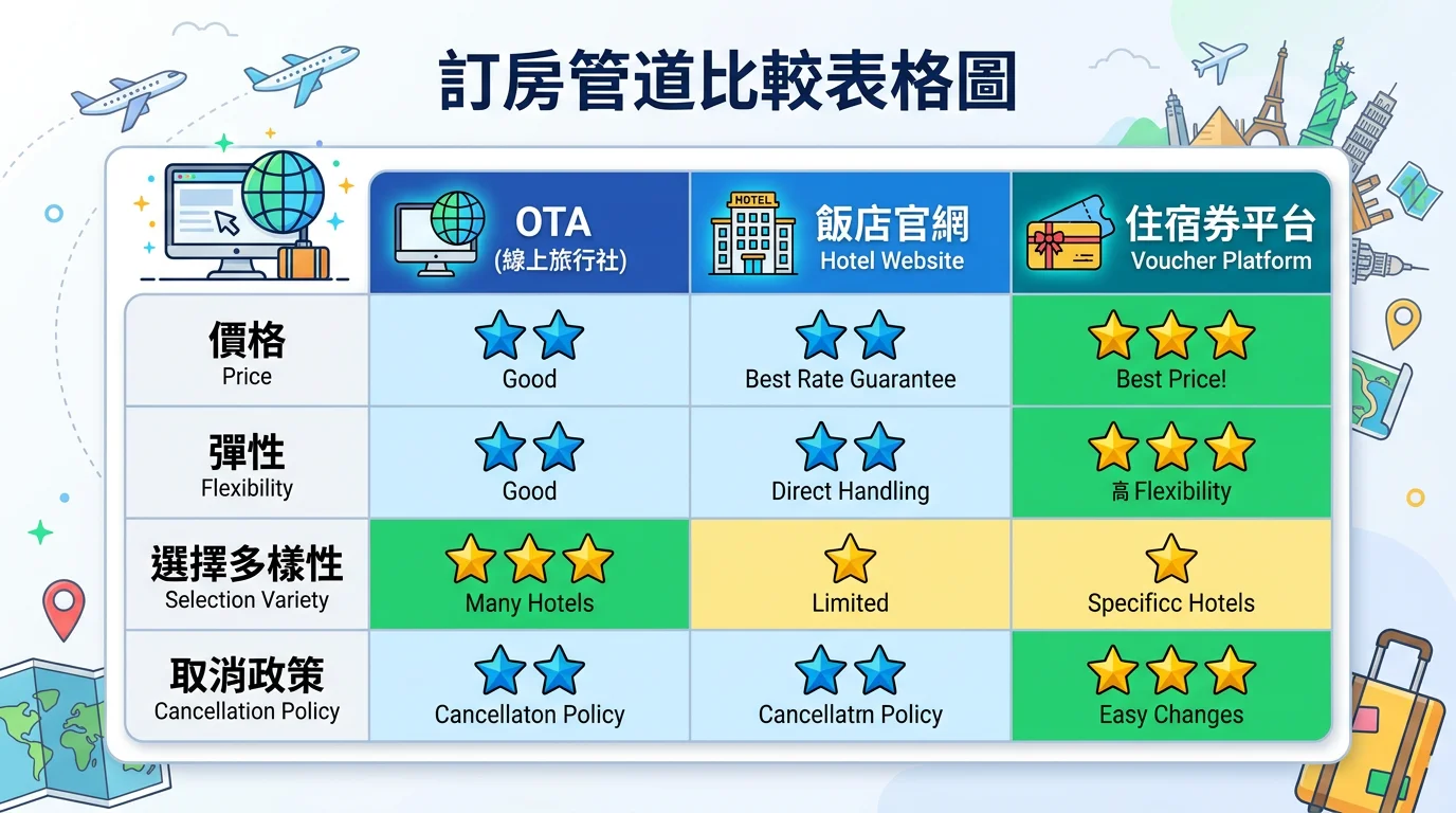 | 住宿券平台 | 價格最低、彈性最高 | 房型選擇較有限 |