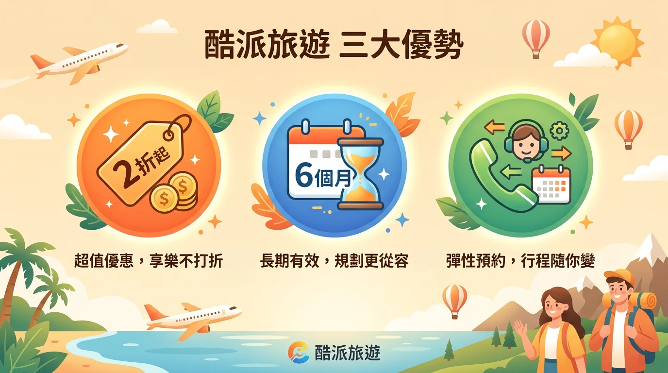 酷派旅遊跟全台 19 間飯店合作,提供 278 個方案。三大優勢:超值價格(最低 2 折)、半年有效、彈性預約。