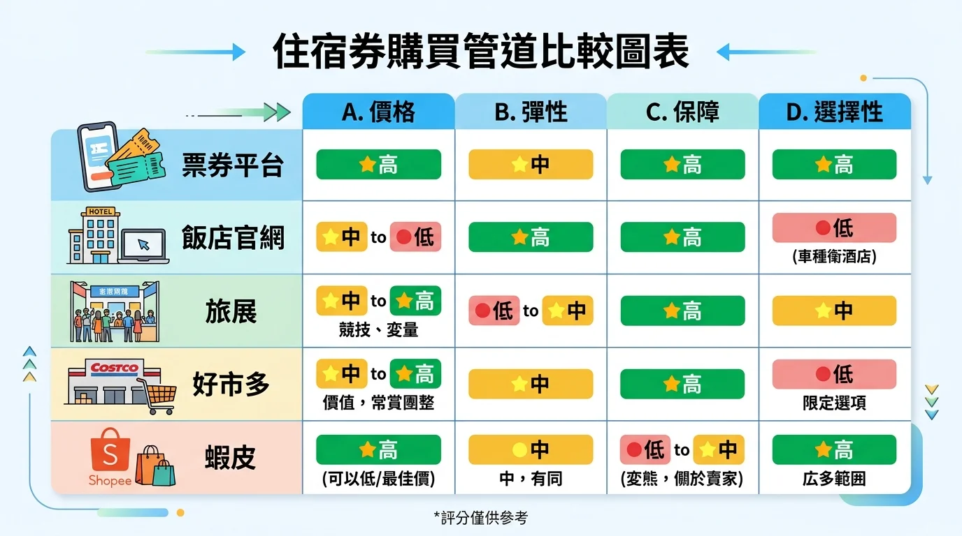好市多偶爾會上架住宿券組合包,CP 值不錯但選擇有限。蝦皮上也有不少住宿券在賣,但品質參差不齊,建議選擇有合法登記、LINE 客服、退費機制完善的平台,比較安心。