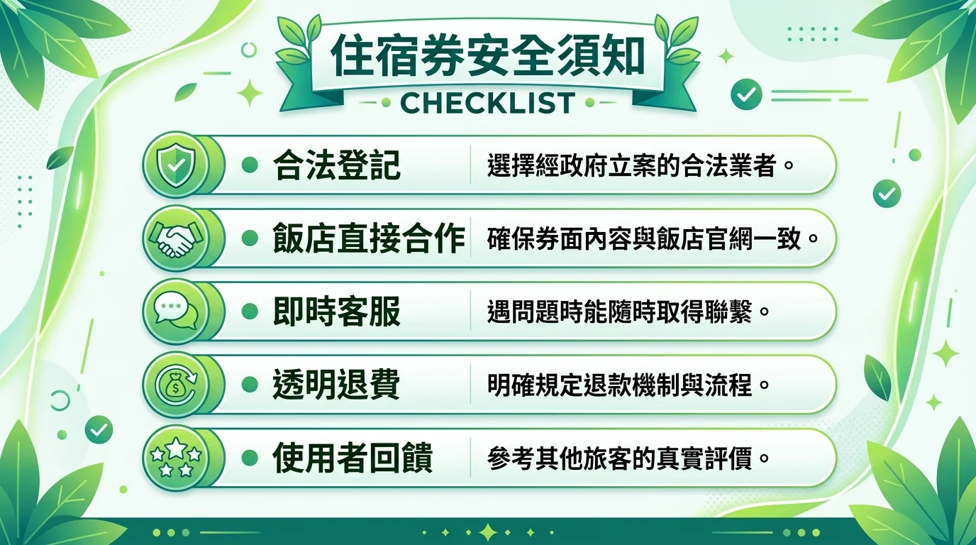 A: 看四個指標:有合法商業登記、和飯店有直接合作關係、提供即時客服管道(如 LINE)、退費機制透明。避免購買來路不明的社群平台住宿券,選擇口碑好的正規平台最安心。