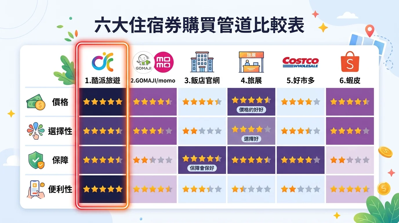 飯店官網直購適合追求最新房型和特定加值服務的人,但價格通常是所有管道中最高的。旅展住宿券要小心使用期限短和假日訂不到房的風險。