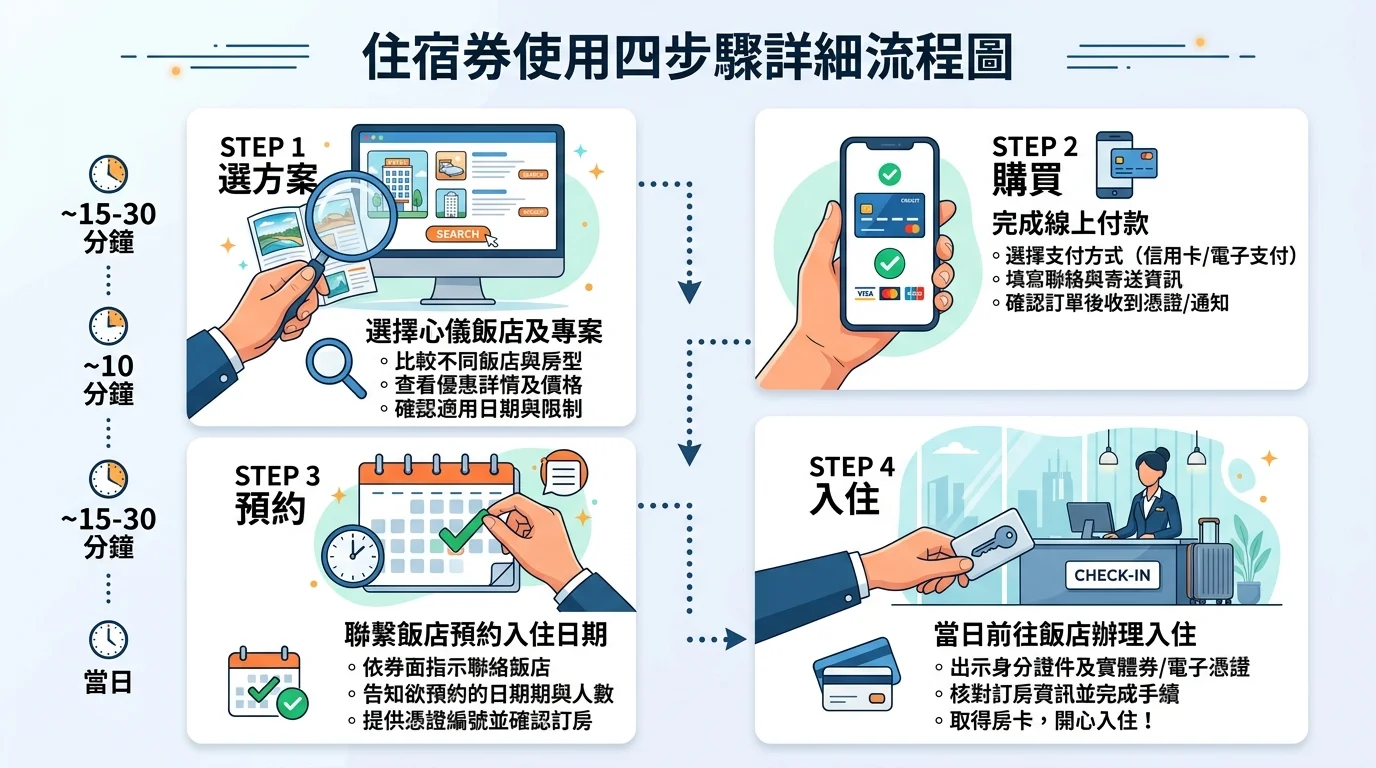 TL;DR: 住宿券就是飯店的預購兌換券,先便宜買下來、之後再約時間去住。使用流程四步驟:選方案 → 購買 → 預約 → 入住。酷派旅遊電子票券低至 2 折、半年有效,是 2026 年最推薦的住宿券購買平台。