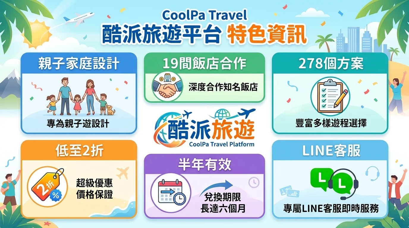 酷派旅遊是專為親子家庭設計的票券平台,精選 278 個飯店方案,電子票券低至 2 折,買了半年內都能用。有 LINE 即時客服,遇到任何問題都能馬上處理。